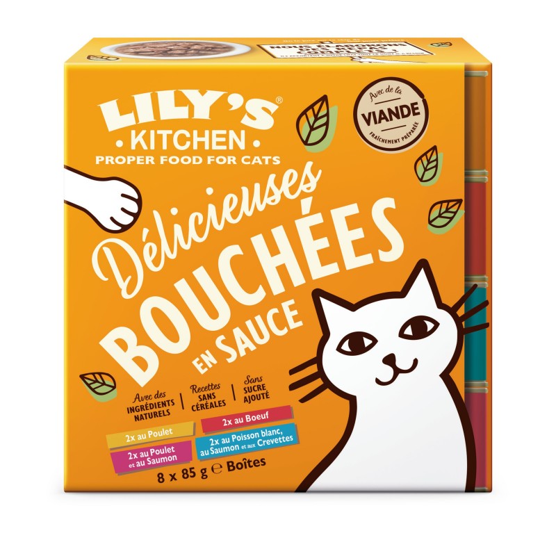 COMPOSITION: Délicieuses bouchées en sauce au poulet: 53 % fraîchement préparés: poulet 40 %, porc 13 %, sauce, minéraux. Délicieuses bouchées en sauce avec du poisson blanc, du saumon et des crevettes: 53 % fraîchement préparés: poisson 26 % (poisson blanc 11 %, saumon 10 %, crevettes 5 %), porc 14 %, poulet 13 %, sauce, minéraux. Délicieuses bouchées en sauce au Boeuf:53 % fraîchement préparés: Boeuf 26 %, poulet 22 %, porc 5 %, sauce, minéraux. Délicieuses bouchées en sauce au poulet, avec du saumon: 53 % fraîchement préparés: poulet 22 %, porc 21 %, saumon 10 %, sauce, minéraux.