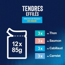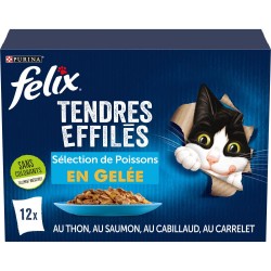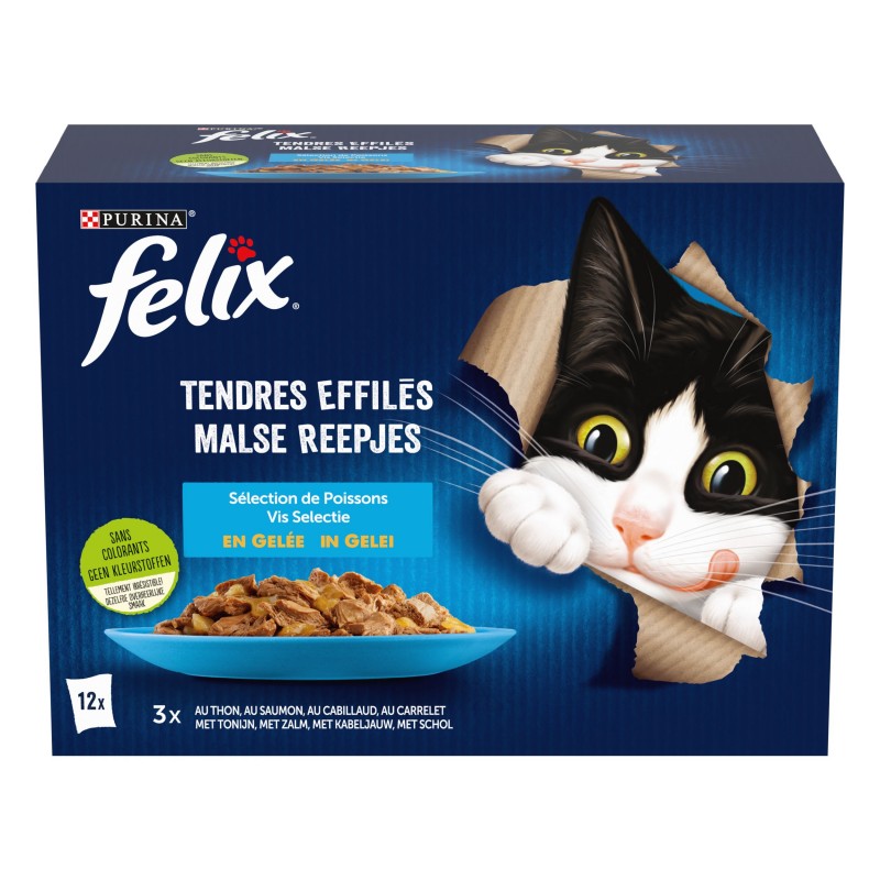 Les Tendres Effilés de FELIX® sont de savoureux repas à l'apparence, à l'odeur et au goût si appétissants que vous auriez pu les cuisiner vous-même. Chaque recette est composée d'ingrédients de qualité et contient de tendres effilés enrobés d’une gelée qui raviront votre chat à tous les repas ! Ces repas sont une source d'acides gras Oméga-6 avec le juste équilibre de vitamines pour aider votre chat à rester en pleine forme et à être prêt pour toujours plus de malice ! Ils contiennent tous les bienfaits nutritifs pour satisfaire 100% des besoins quotidiens de votre chat, selon les rations journalières recommandées sur l'emballage. Et ce n'est pas tout ! Les Tendres Effilés de FELIX® sont disponibles dans une large gamme de délicieuses recettes en gelée pour satisfaire les envies de variété de votre chat. Ils sont vraiment aussi bons qu'ils en ont l'air ! FELIX®, tellement irrésistible !