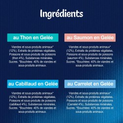 THON: Viandes et sous-produits animaux* (12%), Extraits de protéines végétales, Poissons et sous-produits de poissons (thon 4%), Substances minérales, Sucres. *Bouchées: 40% de viandes et sous-produits animaux. CARRELET: Viandes et sous-produits animaux* (12%), Extraits de protéines végétales, Poissons et sous-produits de poissons (Carrelet 4%), Substances minérales, Sucres. *Bouchées: 40% de viandes et sous-produits animaux. CABILLAUD: Viandes et sous-produits animaux* (12%), Extraits de protéines végétales, Poissons et sous-produits de poissons (cabillaud 4%), Substances minérales, Sucres. *Bouchées: 40% de viandes et sous-produits animaux.