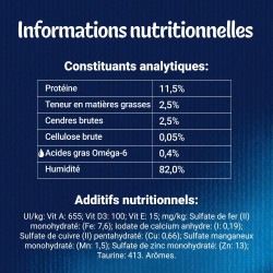 CONSTITUANTS ANALYTIQUES: Humidité: 82%, Protéine: 11,5%, Teneur en matières grasses: 2,5%, Cendres brutes: 2,5%, Cellulose brute: 0,05%, Acides gras Oméga-6: 0,4%.