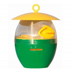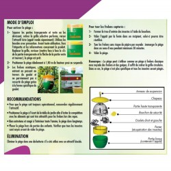 MENTIONS OBLIGATOIRES: Avant toute utilisation, lisez l'étiquette et les informations concernant le produit. • Positionner le piège à l'écart de la table de jardin afin d'éviter la compétition avec les aliments qui sont très attractifs pour les frelons lors des repas. • Bien entretenu et rangé à l'intérieur toute l'année, le piège dure longtemps. • Placer le piège hors de portée des enfants. Vérifier que tous les insectes sont noyés avant de vider le piège. Éliminer l'étui en carton dans la poubelle de recyclage des déchets,et le piège dans une déchetterie.