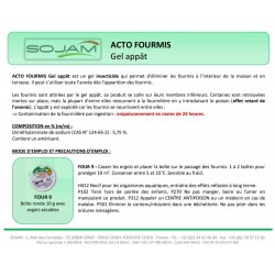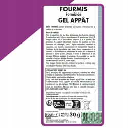 • Contre toutes les espèces de fourmis. • Gel-appât formicide à déposer (en gouttes) sur le trajet des fourmis (en intérieur ou terrasse). • Contamination rapide : agit 24 heures après ingestion, destruction de la colonie en quelques jours, par ingestion et auto-empoisonnement.