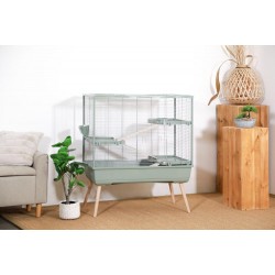 La cage NEOLIFE est un habitat adapté pour le lapin: Grande ouverture pratique sur le dessus: grille en 2 parties, repliable sur elle-même, facilitant la prise de l'animal. Comprends également 1 ouverture frontale. Elle est fournie avec 4 pieds en bois massif permettant de surélever celle ci rappelant ainsi l'univers scandinave tendance et épuré. La sur-élévation de la cage ainsi que les étages offre à l'animal une vision différente et élargie de son environnement. Equipements: - 3 étages en plastique pour faciliter le nettoyage ainsi que leurs échelles en bois. - 1 bol en plastique de 150 ml. - 1 râtelier en plastique. La cage comprends 20% de plastique recyclée.