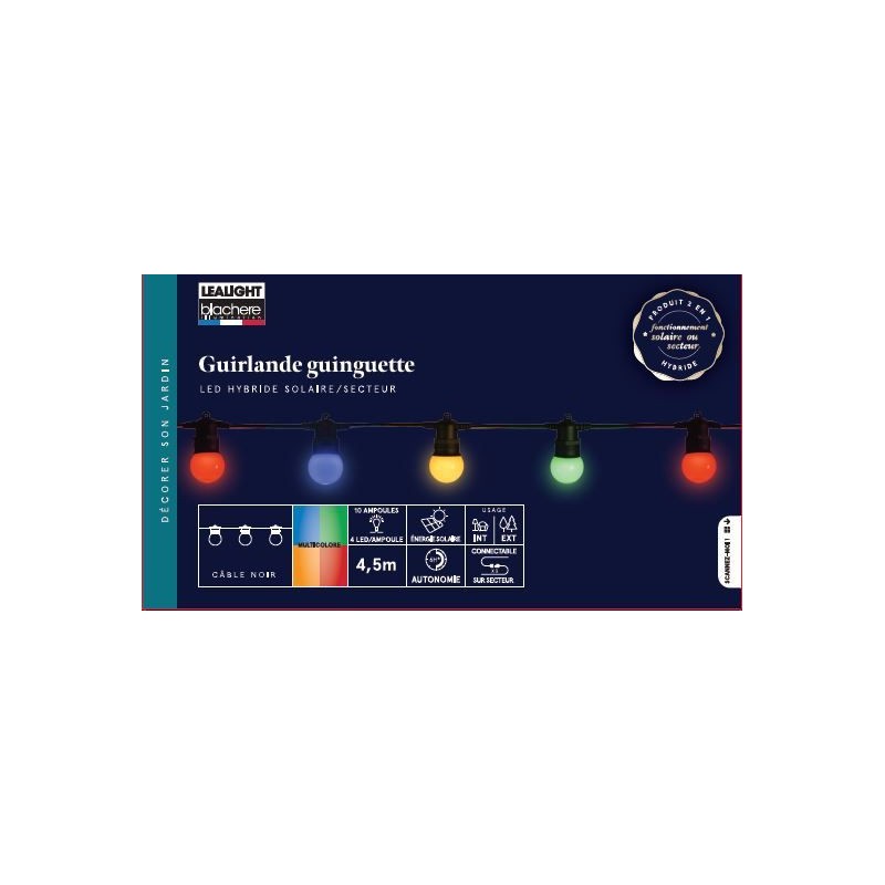 Guirlande Guinguette Led Solaire/Secteur Multicolore Câble Noir 24W Fixe/Pour Intérieur Et Extérieur 4.5M-10L-BLACHERE